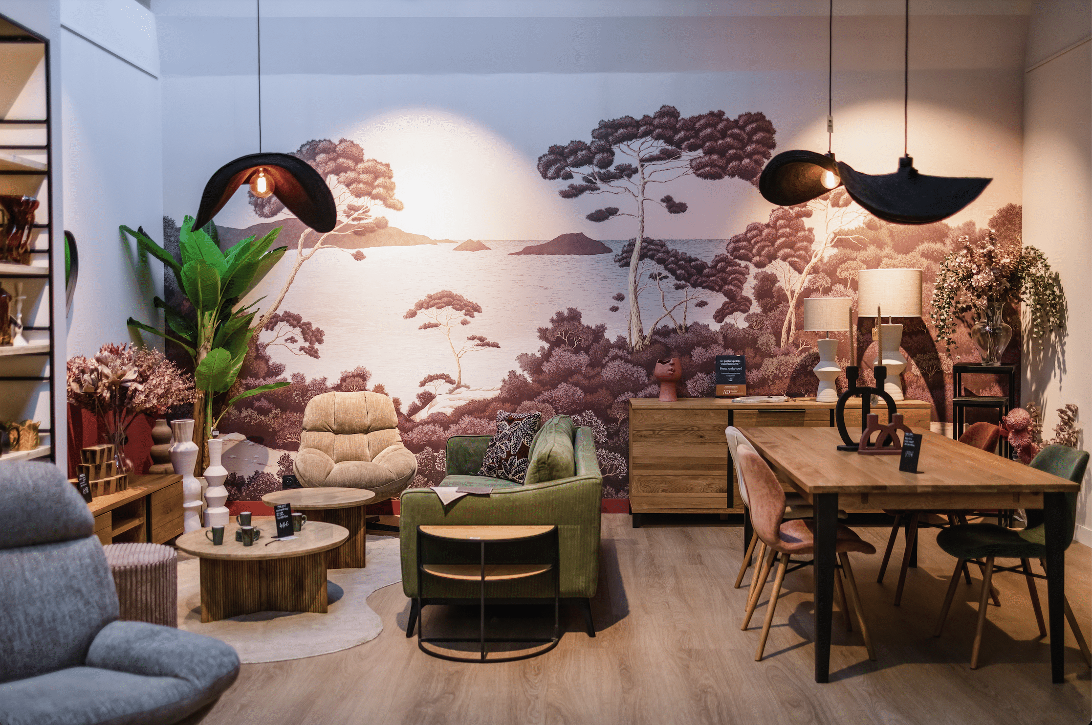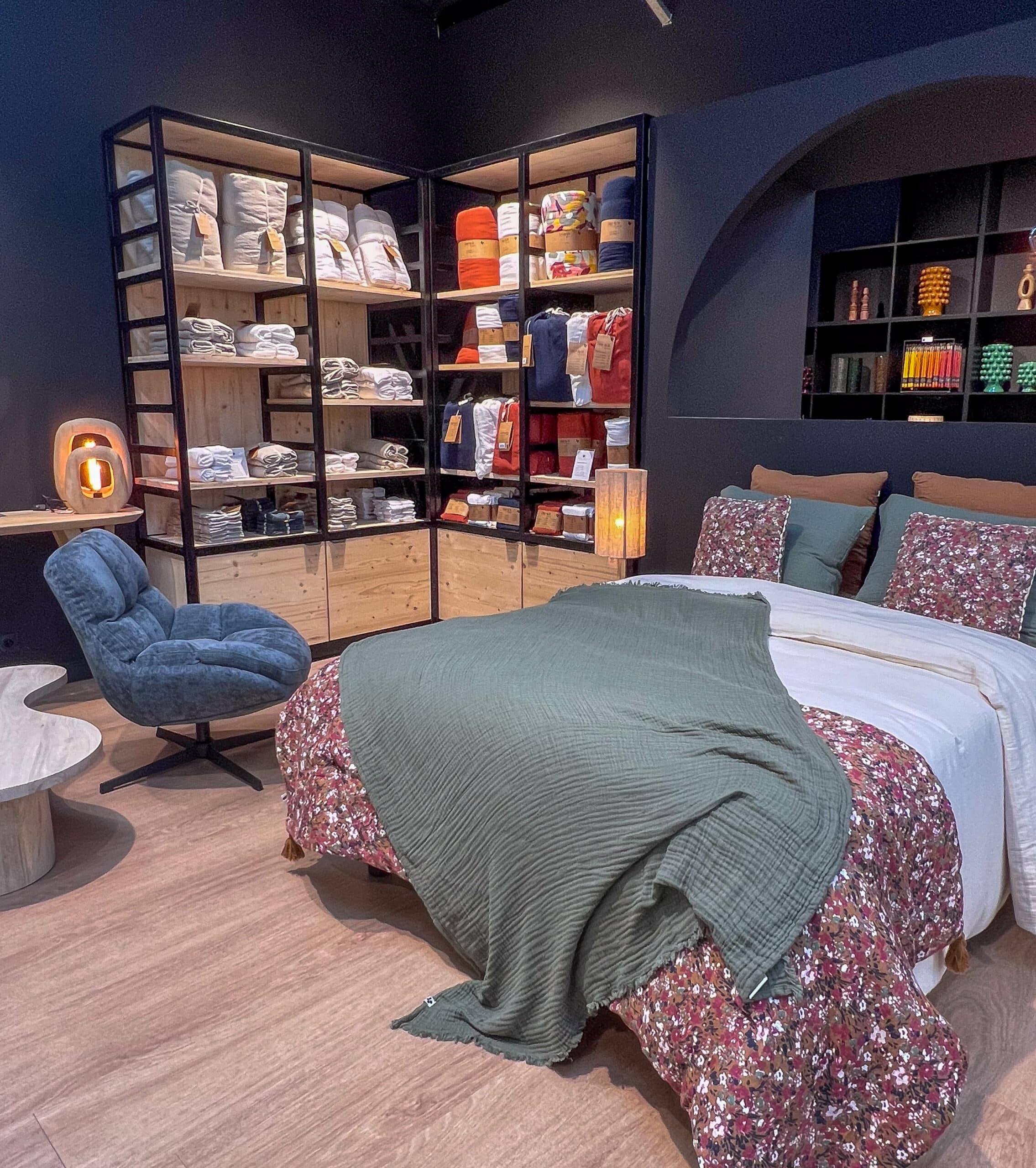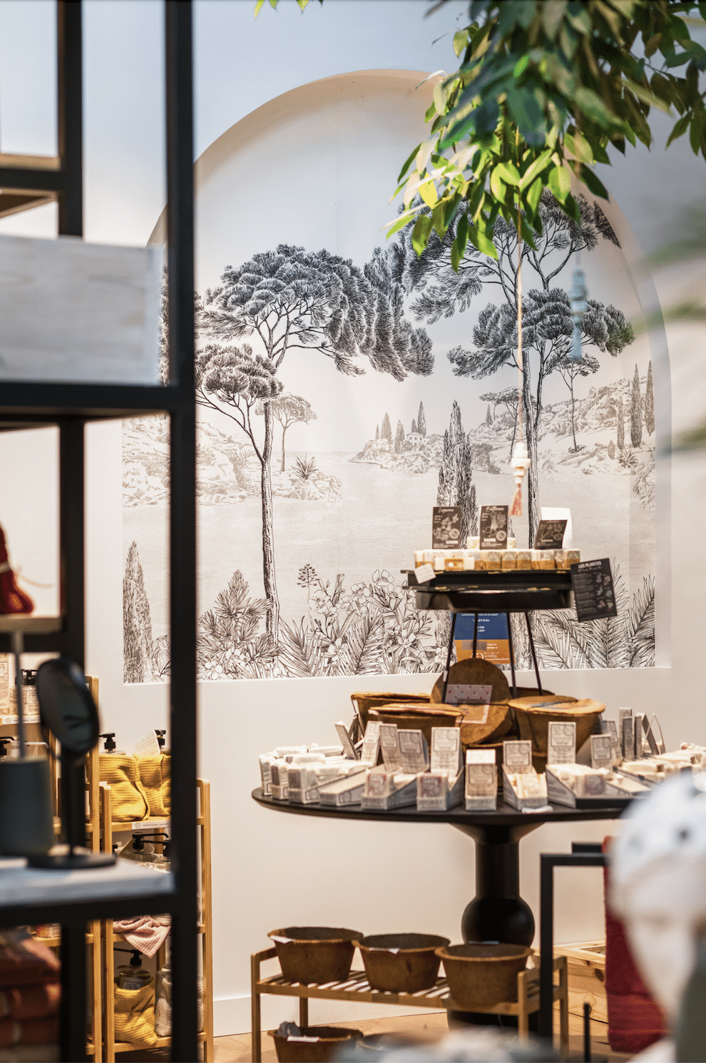 J’ai travaillé sur les formes douces, les arrondis, et des tonalités naturelles – vert, terracotta, beige, blanc – pour créer une ambiance chaleureuse et harmonieuse. Chaque collection trouve naturellement sa place dans des alcôves pensées pour inviter à la découverte.