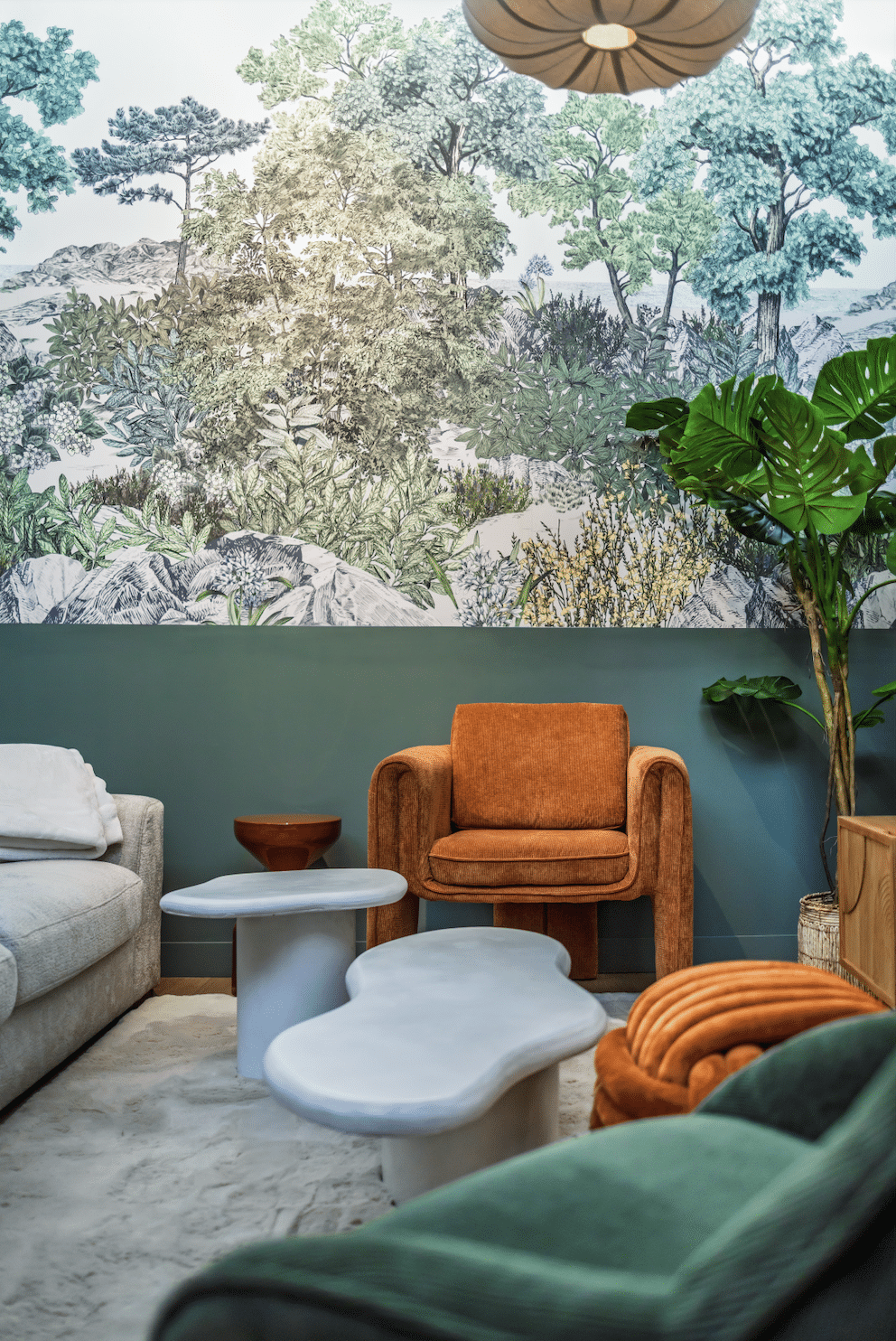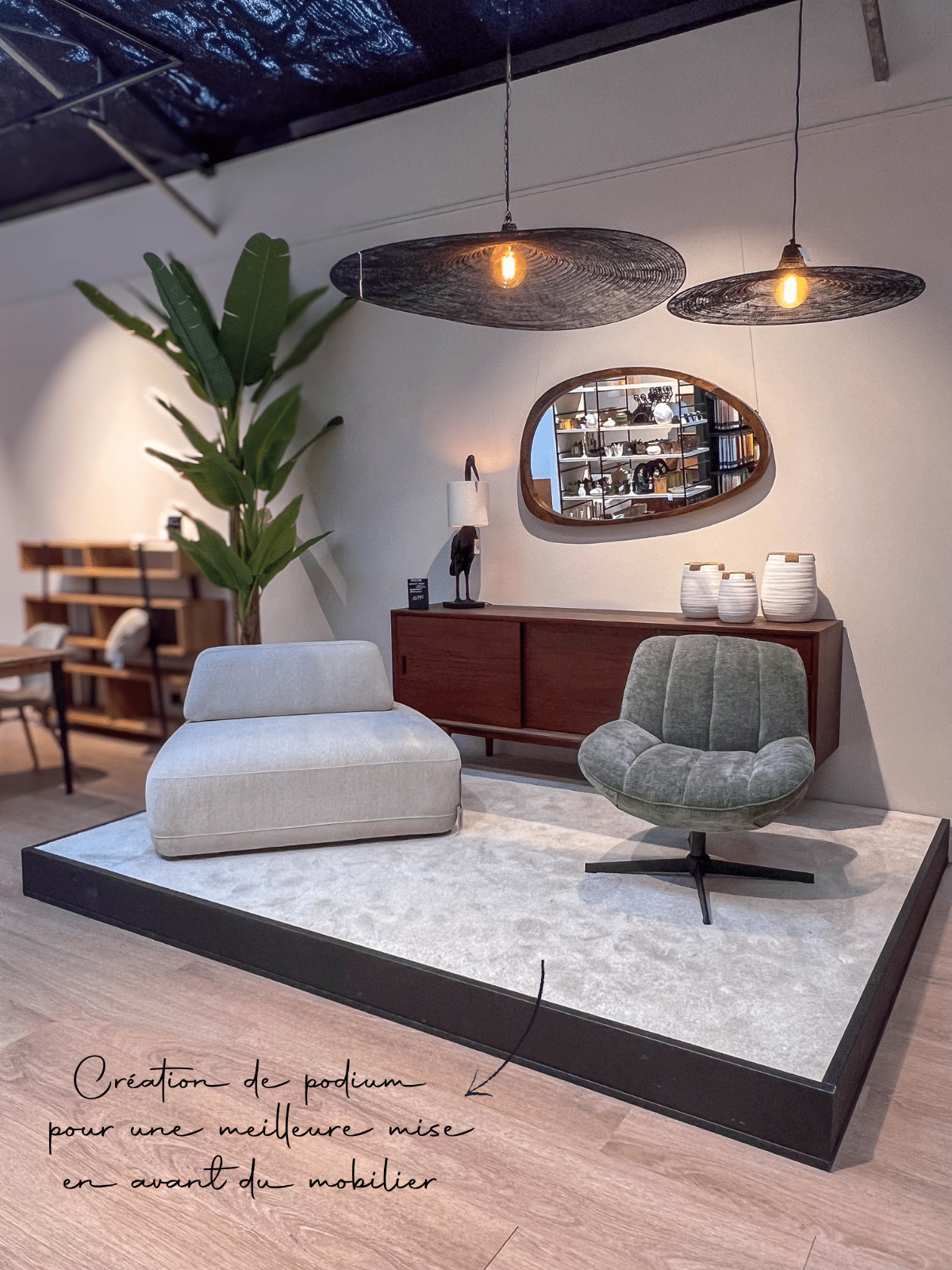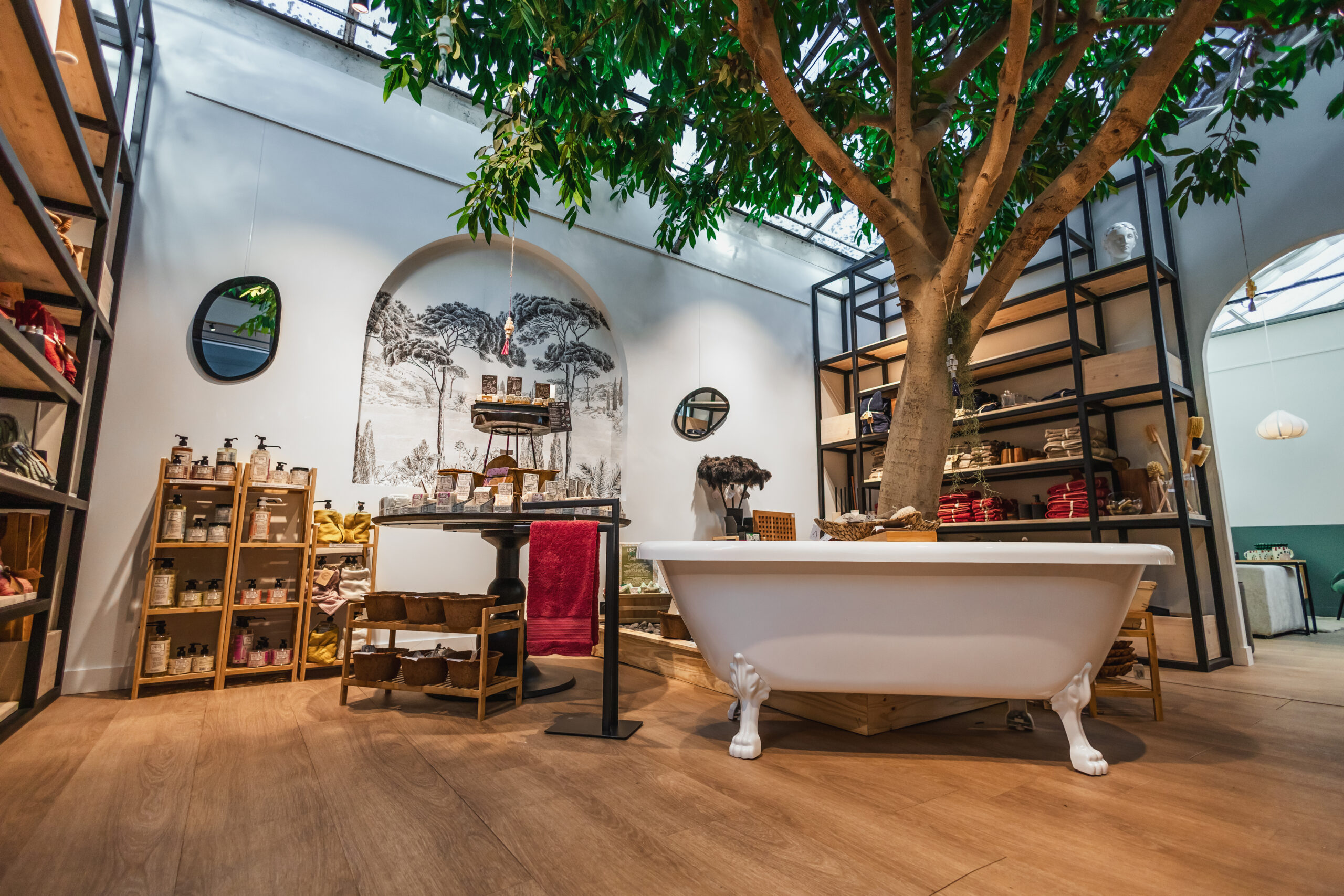 J’ai travaillé sur les formes douces, les arrondis, et des tonalités naturelles – vert, terracotta, beige, blanc – pour créer une ambiance chaleureuse et harmonieuse. Chaque collection trouve naturellement sa place dans des alcôves pensées pour inviter à la découverte.