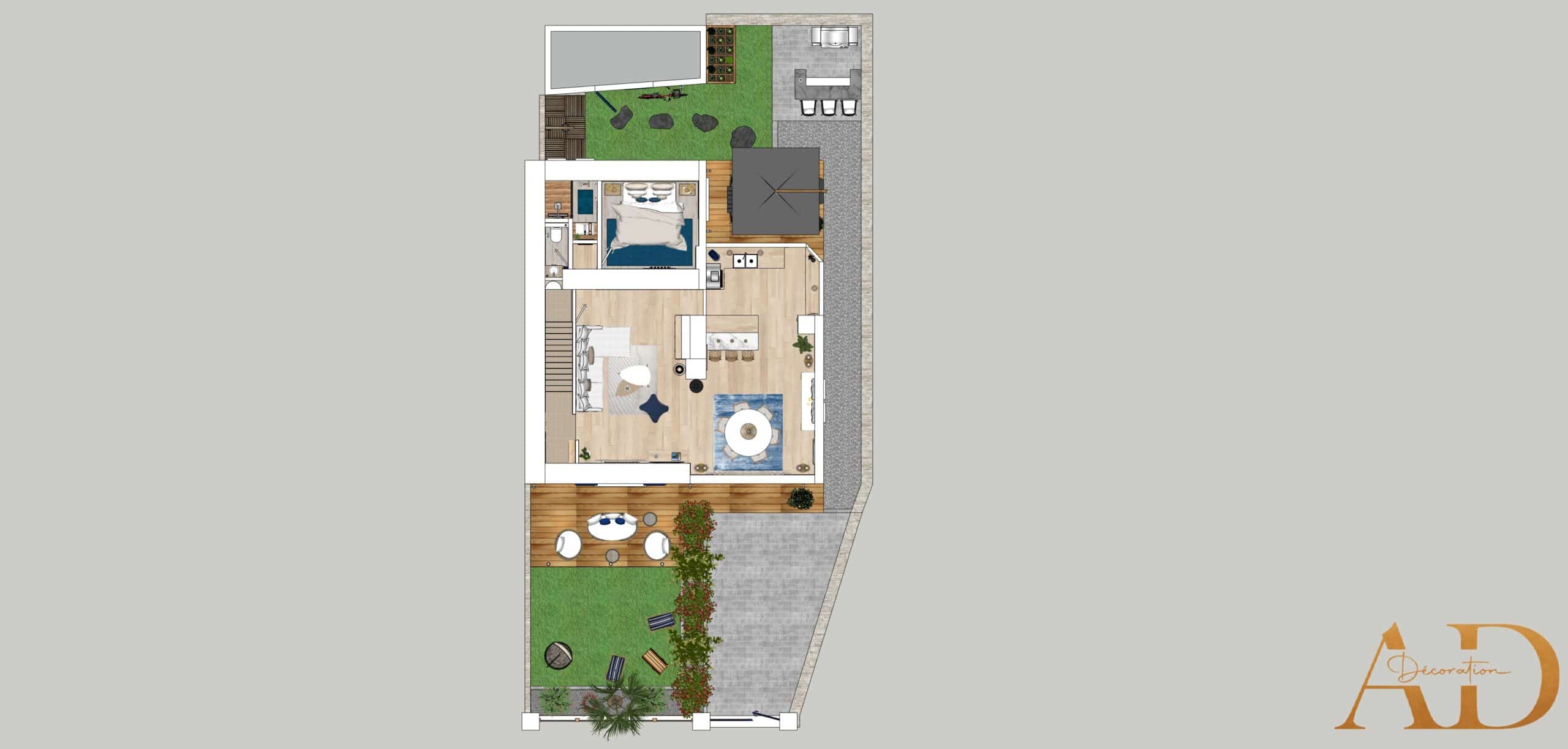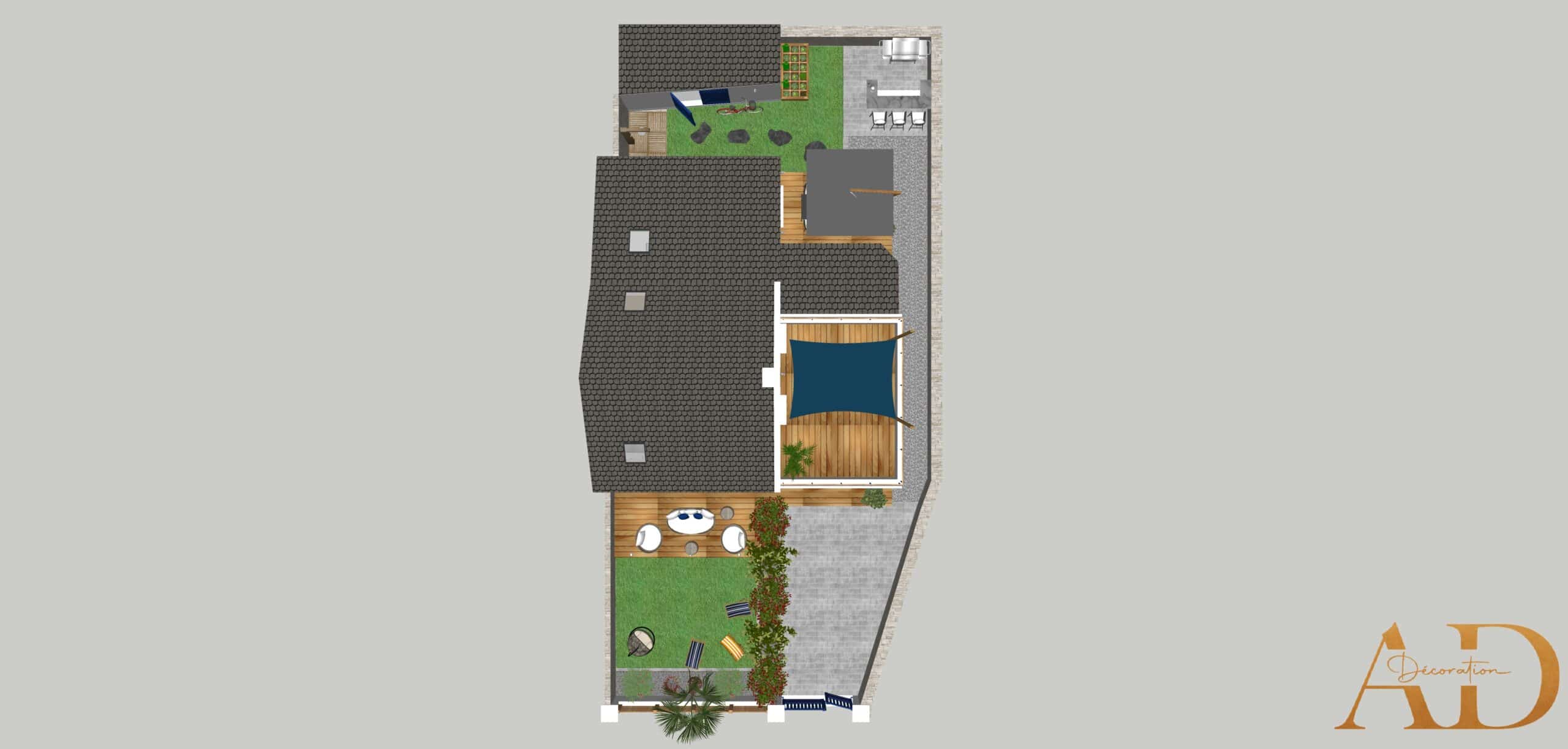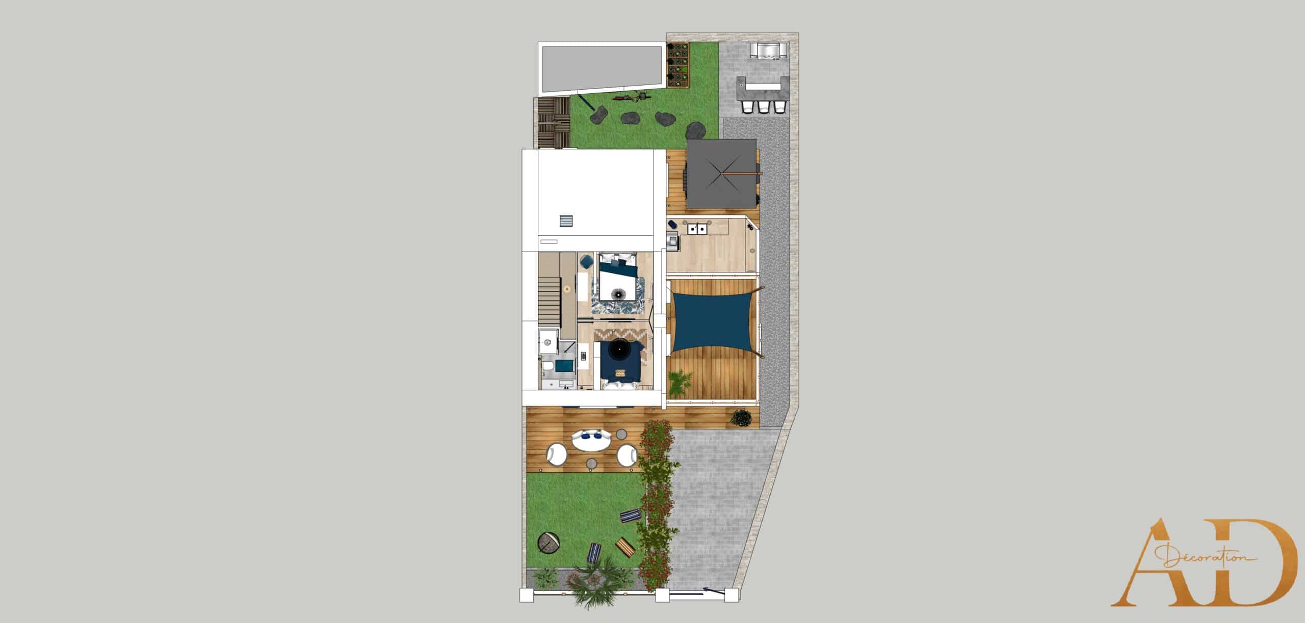 Au nord, le jardin est composé de deux terrasses : La première d’un espace bar avec barbecue et la seconde avec le coin repas.